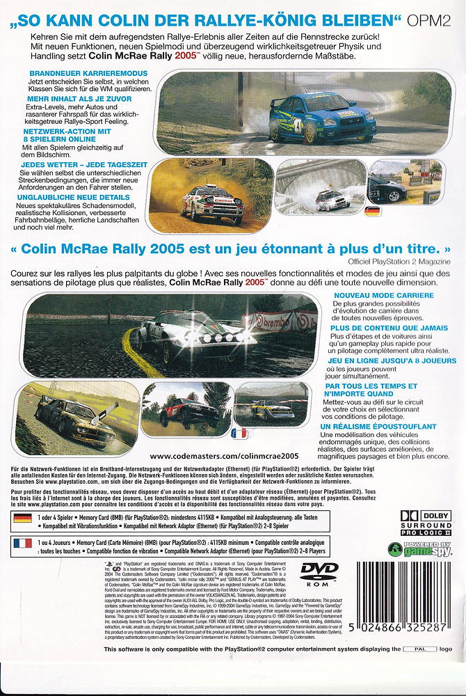 Das Herzstück des Spiels bleibt erneut der Karrieremodus. Neu ist dagegen, dass der angehende Rallye-Pilot sich jetzt von der Pike auf durch lokale Rallye-Events kämpft und im weiteren Verlauf seiner Karriere selbst entscheidet, in welchen Klassen er sich für die Weltmeisterschaft qualifizieren will. Eine weitere Premiere gibt es bei der Online-Fähigkeit der Konsolen-Versionen zu vermelden: PS2 Network Gaming und Xbox Live für bis zu jeweils acht Spieler! Und dieses Mal dürfen sich zusätzlich deutsche Rallye-Fans auf ein ,Heimspiel' freuen, denn erstmalig geht es bei CMR 2005 endlich auch auf deutschen Pisten an den Start. Wie gewohnt legt CMR 2005 bei bereits bewährten Features noch eins obendrauf - bei der nochmals schöneren Optik, dem noch realistischeren und detaillierteren Schadensmodell, mit interaktiven Streckenobjekten, u.v.m.