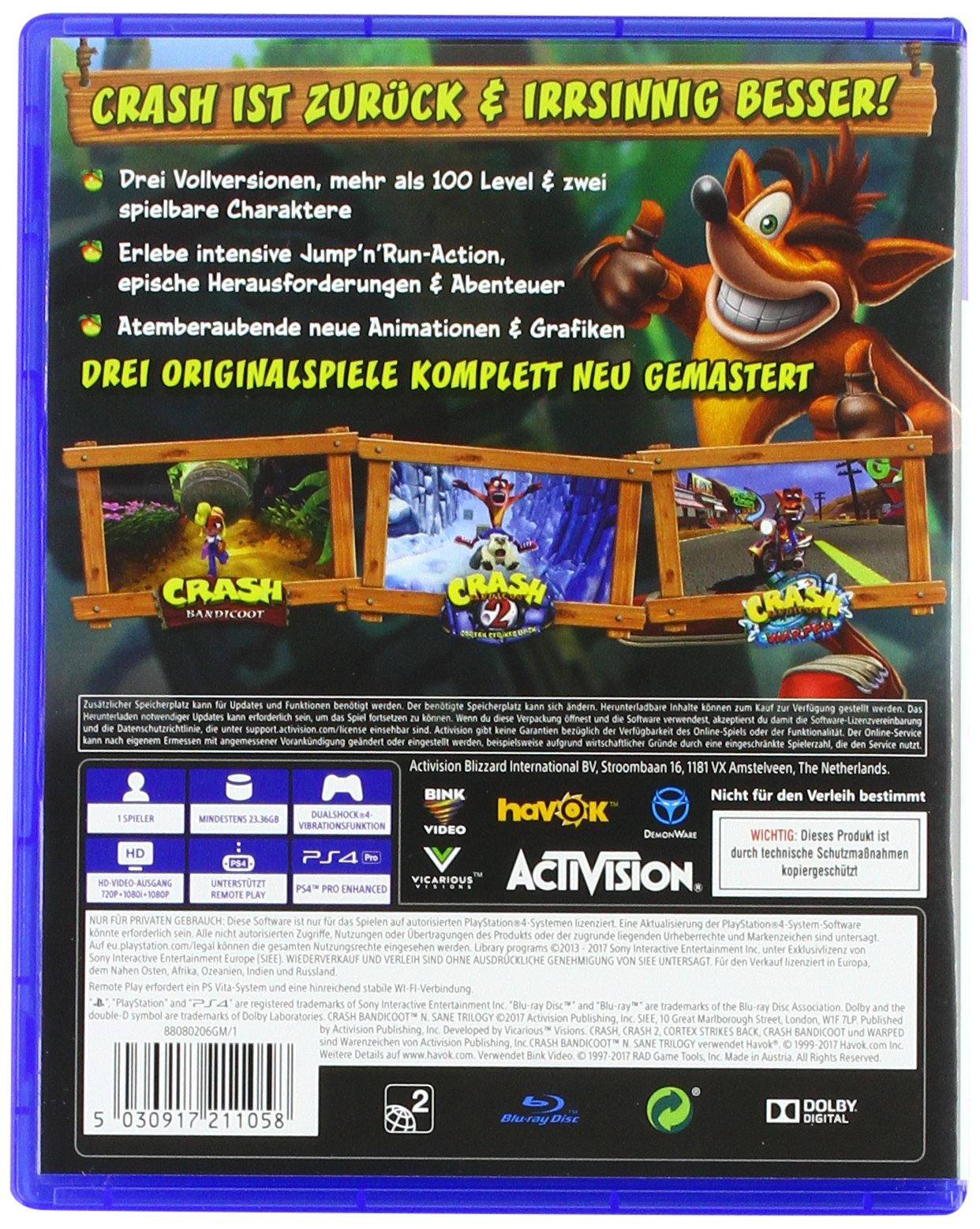 Die Inhalte der N. Sane-Trilogy, Crash Bandicoot, Crash Bandicoot 2: Cortex Strikes Back und Crash Bandicoot 3: Warped, wurden mit viel Liebe und der neuesten Technologie von Grund auf neu erschaffen, inklusive brandneuer Tonaufnahmen der Originalsprecher und neuen Inhalten, um das klassische Gameplay der Serie einer ganz neuen Generation zu präsentieren.