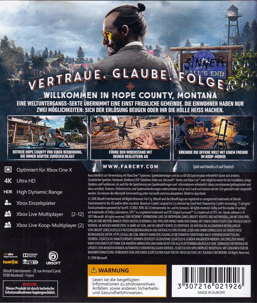 Willkommen in Hope County, Montana. Dieser idyllische Ort ist das Zuhause einer freiheitsliebenden Gemeinde, die von einem fanatischen Kult terrorisiert wird, der an die Apokalypse glaubt. Der Kult trägt den Namen „Project at Eden’s Gate“ und wird vom charismatischen Propheten Joseph Seed und seinen treuen Geschwistern, den Herolden, angeführt. Schleichend hat er die Kleinstadt und jeden Aspekt des alltäglichen Lebens übernommen. Als die Ankunft des Protagonisten den Kult dazu anstiftet mit Gewalt die Region in ihre Kontrolle zu bringen, muss er sich erheben und ein Feuer des Widerstandes entfachen, um die Gemeinde zu befreien.
