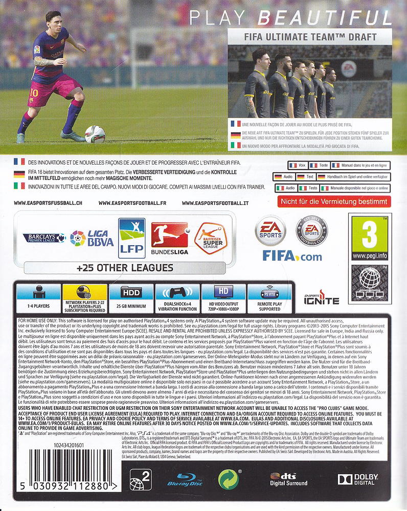 FIFA 16 bietet Innovationen auf dem gesamten Platz und sorgt für ein ausgewogenes, authentisches und begeisterndes Fussballerlebnis. Spiele so, wie du es möchtest und entwickle dich dabei stetig weiter. Durch die VERBESSERTE VERTEIDIGUNG und die KONTROLLE IM MITTELFELD produzierst du mehr MAGISCHE MOMENTE als je zuvor. Mit dem neuen FIFA-TRAINER können erfahrene FIFA-Spieler ihre Fähigkeiten erweitern und Neueinsteiger erhalten einen erleichterten Einstieg. Du entscheidest über den Ausgang des Spiels. FIFA 16 Play Beautiful! Weitere Features werden in den nächsten Monaten vor der Veröffentlichung des Spiels bekannt gegeben.