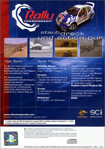 25 der schnellsten lizensierten Rallye-Wagen der Welt. Beinharte Action auf 33 Etappen in 6 internationalen Rallies. Mit atemberaubend leistungsstarker Schadensengine, ständig wechselnden Wetterbedingungen, realistischer Rallye-Technik und Fahrphysik liefert Ihnen dieses Spiel einen Crash-Kurs in Sachen Rally pur. FEATURES: - Schnelles Rennen: Rasante Rallye-Action mit allen Wagen, auf allen Etappen - Karriere: Die ultimative Herausforderung: starten Sie als Amateur und arbeiten Sie sich zur Meister-Klasse hoch - Arcade: Arcade-Rennen mit Spielhallen-Atmosphäre - Multiplayer: 2-4 Spieler, im Splitscreen.