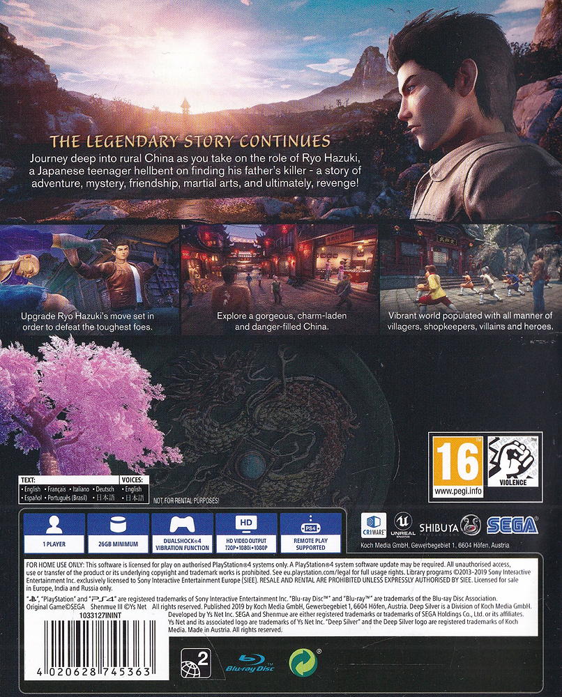 Im dritten Teil der epischen Shenmue-Serie will Ryo das Geheimnis um den Spiegel des Phönix lüften, das Artefakt, nach dem der Mörder seines Vaters sucht. Seine Reise führt ihn durch detailgetreu nachgebildete, geschäftige Dörfer, umgeben von den pittoresken Landschaften Chinas.