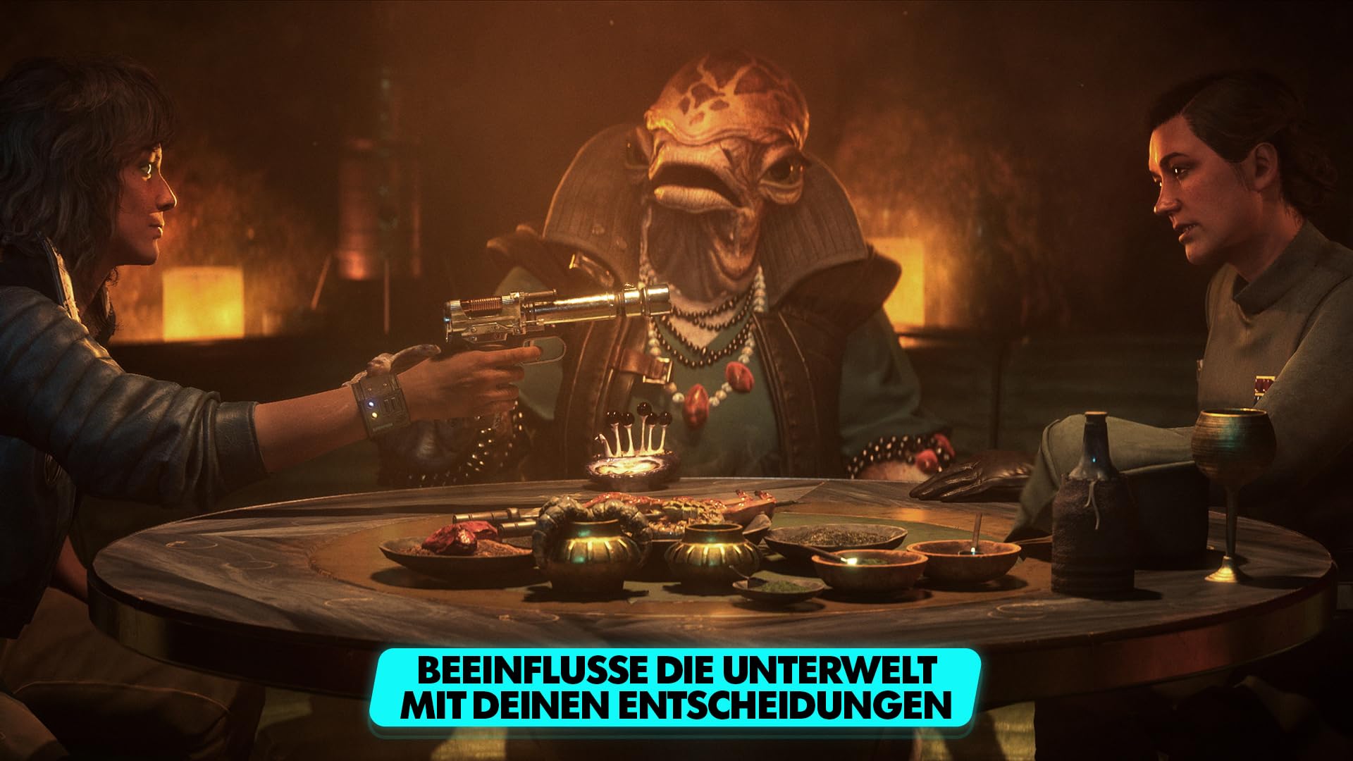 Lebe den gefährlichen Alltag einer Gesetzlosen. Drehe mit Nix an deiner Seite jede Situation zu deinem Vorteil. Kämpfe mit deinem Blaster, überwinde Gegner durch Schleichen und Geräte oder warte auf den richtigen Moment, sie abzulenken und die Oberhand zu gewinnen.