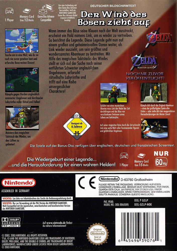 Endlich hat das Warten ein Ende! Mit Legend of Zelda - The Wind Waker wird die Erfolgsserie auf dem Nintendo GameCube fortgesetzt. In seinem ersten eigenen GameCube Abenteuer wird Link in die idyllische Inselwelt eines Ozeans versetzt. Doch das friedliche Leben auf dem Eiland wird zerstört, als ein Raubvogel Links geliebte Schwester entführt. Natürlich zögert unser Held keine Sekunde und macht sich auf die Reise, um sie aus den Fängen des Monsters zu befreien. Auf seiner waghalsigen Reise muss Link alles einsetzen, was er hat: Bekannte Items wie Pfeil & Bogen, Bomben, Enterhaken und Bumerang, aber auch neue Tools wie den Wind Waker, mit dem er Melodien spielen und so Macht über den Wind gewinnen kann. Ausserdem kann Link nun die Tageszeit ändern oder die Kontrolle über andere Figuren übernehmen.