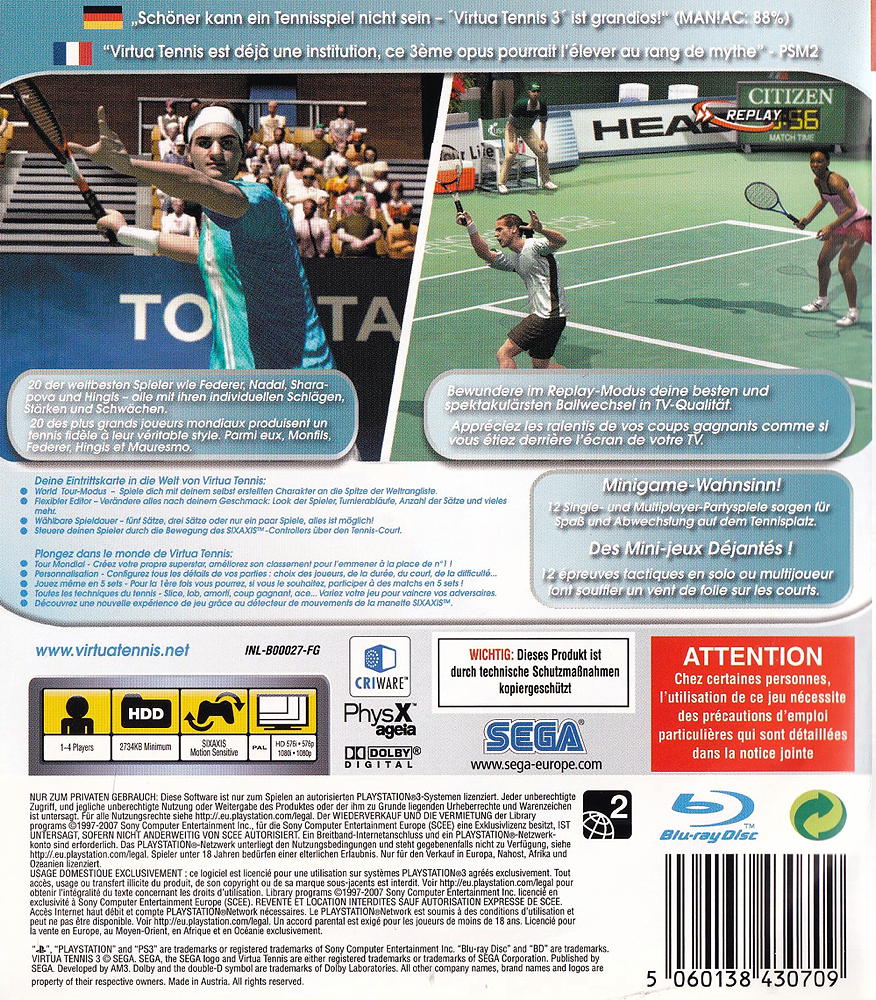 Die nächste Generation Virtua Tennis schlägt auf der PlayStation 3 auf. Die Spieler können bis ins kleinste Detail den Gesichtsausdruck ihrer original Stars sehen, während sie spannende Turniere auf der ganzen Welt bestreiten. Durch die verbesserte Gegner-KI steigt die Herausforderung. Wer kann sich unter den Top- Spielern der Tenniswelt behaupten?