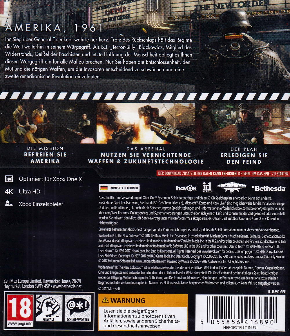 Ihr Sieg über General Totenkopf währte nur kurz. Trotz des Rückschlags hält das Regime die Welt weiterhin in seinem Würgegriff. Als B. J. „Terror-Billy" Blazkowicz, Mitglied des Widerstands, Geissel der Faschisten und letzte Hoffnung der Menschheit obliegt es lhnen, diesen Würgegriff ein für alle Mal zu brechen. Nur Sie haben die Entschlossenheit, den Mut und die nötigen Waffen, um die Invasoren entscheidend zu schwächen und eine zweite amerikanische Revolution einzuläuten.