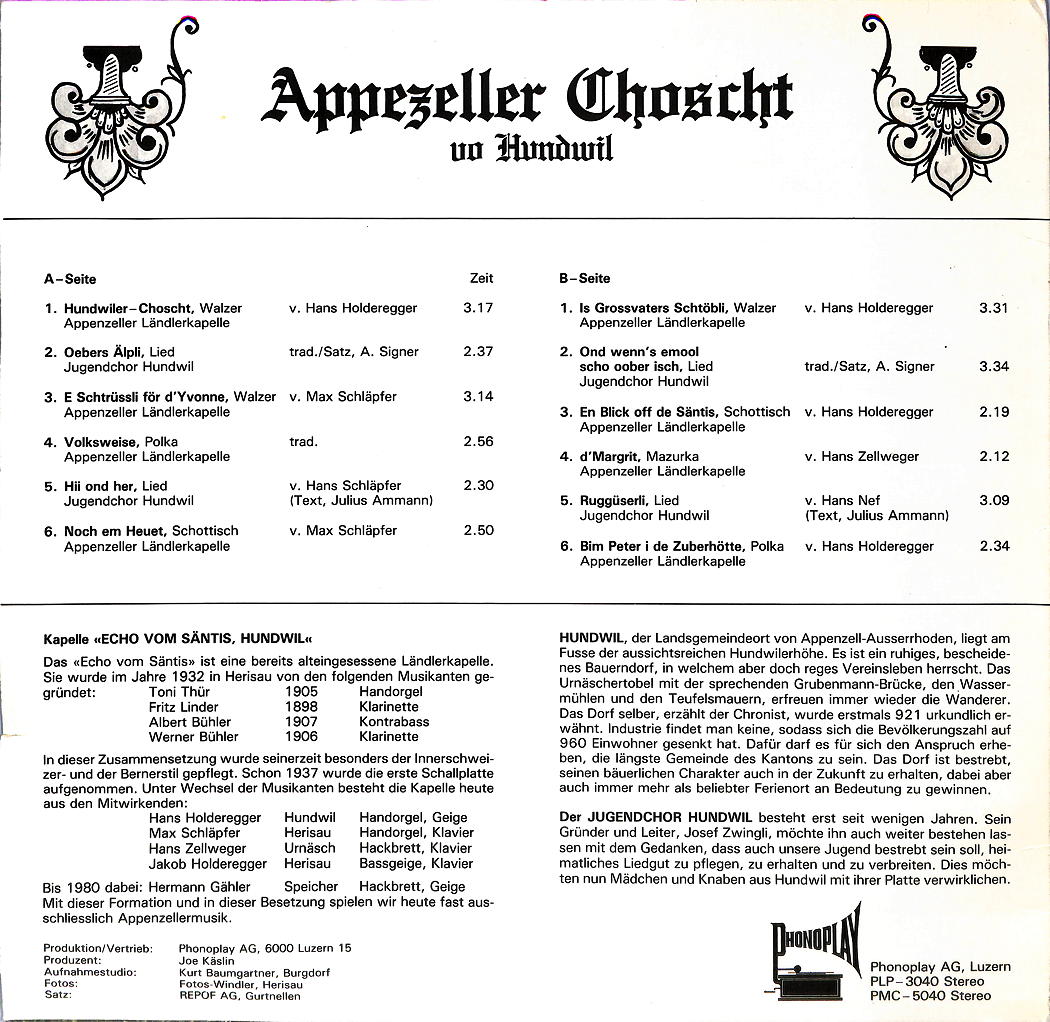 A1 –Appenzeller Ländlerkapelle "Echo Vom Säntis" Hundwil* Hundwiler-Choscht 3:17