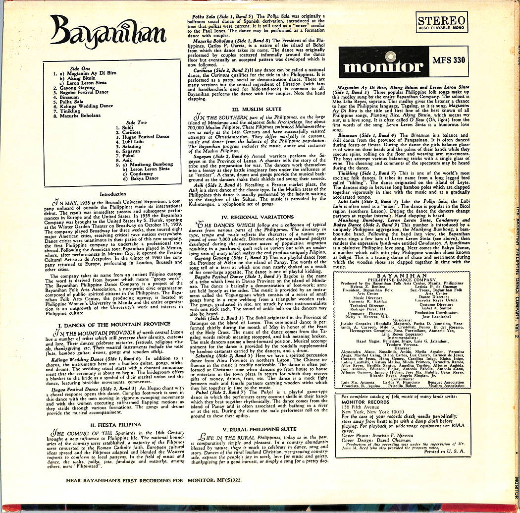 Performer [Dancer] – Alessandra Alano, Alfonso Ambida, Alfonso Guino-o, Alice Reyes, Angelita Toribio, Angelo Singian, Jr., Antonio Fabella, Antonio Gana, Benilda Santos, Carmelita Ramos, Carmen De Jesus, Carolina Inigo, Cesar Reyes, Corazon De Jesus, Cristina Matias, Diana Carlos, Eduardo Elejar, Eloisa Inigo, Hana Gomez, Ignacio Hieban, Jose Antonio (5), Jose Ma. Hubilla, Loline Lualhati, Luz Castro, Maribel Carag, Minda Primero, Ricardo Reyes (5), Rosalinda Anido, Sheila Ascalon, Veronica Atega
