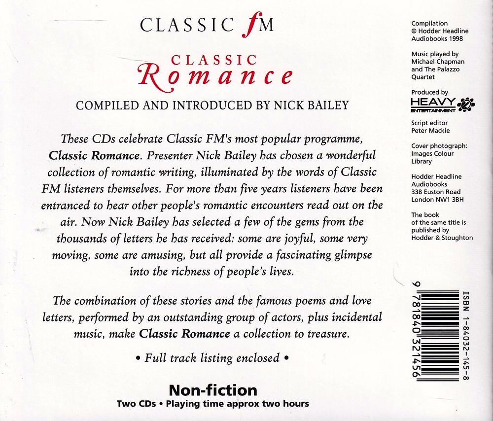 These CDs celebrate Classic FM's most popular programme, Classic Romance. Presenter Nick Bailey has chosen a wonderful collection of romantic writing, illuminated by the words of Classic FM listeners themselves. For more than five years listeners have been entranced to hear other people's romantic encounters read out on the air. Now Nick Bailey has selected a few of the gems from the thousands of letters he has received: some are joyful, some very moving, some are amusing, but all provide a fascinating glimpse into the richness of people's lives.