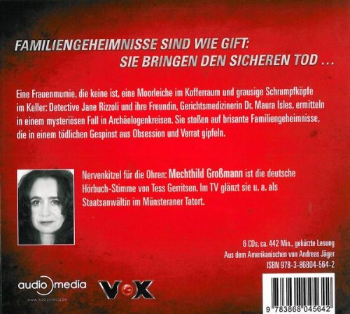 Eine mumifizierte Frauenleiche, grausige Schrumpfköpfe und eine Moorleiche - Detective Jane Rizzoli und ihre Freundin, die Gerichtsmedizinerin Dr. Maura Isles, stehen vor ihrem bisher schwierigsten Fall. Sie ermitteln in Archäologenkreisen und kommen einem teuflischen Gespinst aus Besessenheit und alten Familiengeheimnissen auf die Spur...gekürzte Lesung, 6 CDs, Hördauer ca. 442 Min.