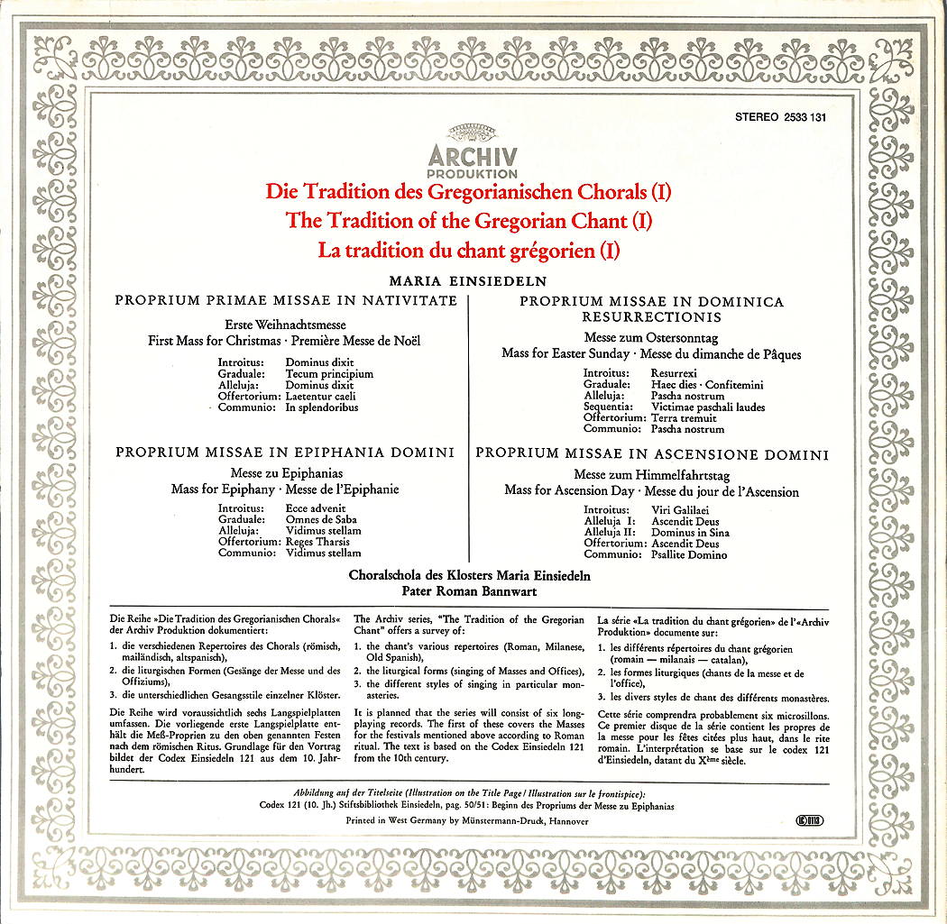 Chorus Master [Director], Liner Notes – Pater Roman Bannwart