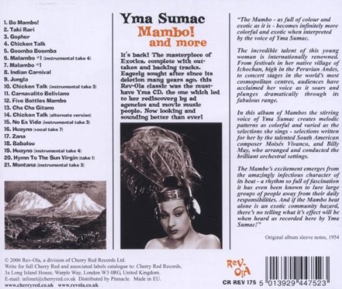 Yes, the classic early RevOla edition of this masterpiece of Exotica, complete with the outtakes and backing tracks that made it such a hit with not only fans, but on the amazing Miss Sumac's own website, eagerly sought after by everyone since it's deletion many years ago, this staple of the first Creation run of RevOla is once more available!! This was the must-have Yma Sumac CD, the one which led to her rediscovery by ad agencies and movie music supervisors looking and sounding even better! Believe it!! Beautifully re-mastered from the original tapes! Contains sessions-in-progress and rarities from these amazing classic sessions. Wonderful sumptuous packaging in true RevOla style! THE definitive edition of this masterpiece of Exotica, available once more, a total MUST for everyone!