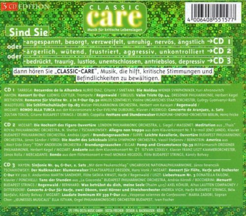 ROYAL PHILHARMONIC ORCHESTRA, N. Shetler / TSCHAIKOWSKY: Allegro non troppo aus dem Klavierkonzert Nr. 1 b-moll JENÖ JANDO, Klavier BUDAPEST PHILHARMONIC ORCHESTRA, András Ligeti / Brandungsrauschen / SUPPE: Leichte Kavallerie, Ouvertüre BUDAPEST PHILHARMONIC ORCHESTRA, János Sándor / VERDI: Die Macht des Schicksals SOFIA SYMPHONY ORCHESTRA, Vassil Stefanov / BERNSTEIN: America aus West Side Story" TONY ANDERSON ORCHESTRA / Brandungsrauschen / ELGAR: Pomp and Circumstance Op.39 Militärmarsch DRESDNER PHILHARMONIE, Herbert Kegel / MOZART: Andante aus dem Klavierkonzert Nr. 21 ISTVAN SZEKELY, Klavier FRANZ LISZT KAMMERORCHESTER, János Rolla / MERCADANTE: Rondo aus dem Flötenkonzert e-moll MONIKA HEGEDÜS, Flöte BUDAPEST STRINGS, Károly Botvay CD 3 HAYDN: Sinfonie Nr. 94 G-Dur, 2. Satz „Mit dem Paukenschlag" UNGARISCHE NATIONALPHILHARMONIE, János Ferencsik TSCHAIKOWSKY: Der Nussknacker: Blumenwalzer STAATSKAPELLE DRESDEN, Hans Vonk / MOZART: Konzert für Flöte, Harfe und Orchester C-Dur KV 299 ||. Andantino MARTIN SANDHOFF, Flöte SASKIA KWAST, Harfe / Regewald / LISZT: Liebestraum Nr. 3 DONATELLA FAILONI, Klavier / PONCHIELLI: Tanz der Stunden aus „La Gioconda" BUDAPEST PHILHARMONIC ORCHESTRA, András Kórodi / BOCCHERINI: Menuett BUDAPEST STRINGS / Regenwald / BERNHARD: Was betrübst du dich, meine Seele (Psalm 4215) AXEL KÖHLER, Altus LAUTTEN COMPAGNEY /