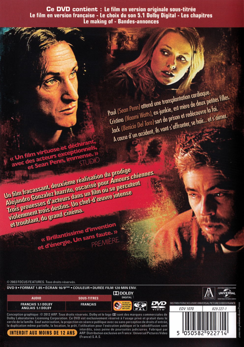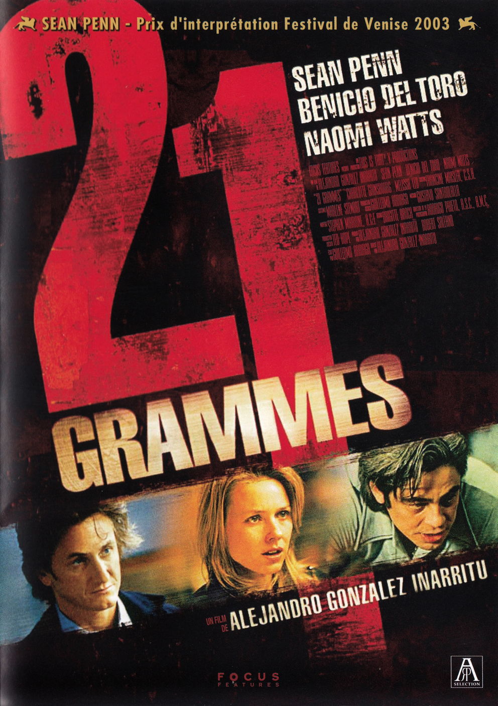 On dit que nous perdrons tous 21 grammes au moment précis de notre mort... Paul attend une transplantation cardiaque. Cristina, ex-junkie, est mère de deux petites filles. Jack sort de prison et redécouvre la foi. A cause d'un accident, ils vont s'affronter, se haïr... et s'aimer. 21 grammes : le poids de 5 pièces de monnaie , le poids d'une barre de chocolat , le poids d'un colibri. Est-ce le poids de notre âme ? Est-ce le poids de la vie?