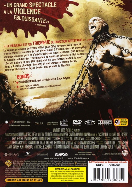 Adapté du roman graphique de Frank Miller, 300 est un récit épique de la Bataille des Thermopyles, qui opposa en l'an - 480 le roi Léonidas et 300 soldats spartiates à Xerxès et l'immense armée perse. Face à un invincible ennemi, les 300 déployèrent jusqu'à leur dernier souffle un courage surhumain ; leur vaillance et leur héroïque sacrifice inspirèrent toute la Grèce à se dresser contre la Perse, posant ainsi les premières pierres de la démocratie.
