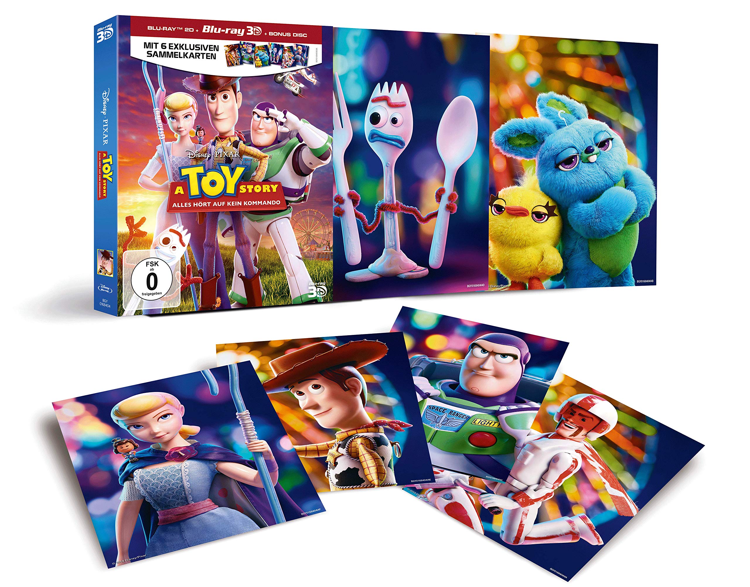 Bonusmaterial: Porzellinchen ganz neu Toy Stories Audiokommentar mit Regisseur Josh Cooley & Produzent Mark Nielsen Toy Box: Gabby Gabby & ihre Gang, Forky, Duke Caboom, Ducky & Bunny, Giggle McDimples Unterwegs mit Ally Maki Woody & Buzz Anatomie einer Szene: Spielplatz Zusätzliche Szenen Internationale Trailer Jahrmarkt-Preise Flug übers Set: Jahrmarkt, Blick vom Dach