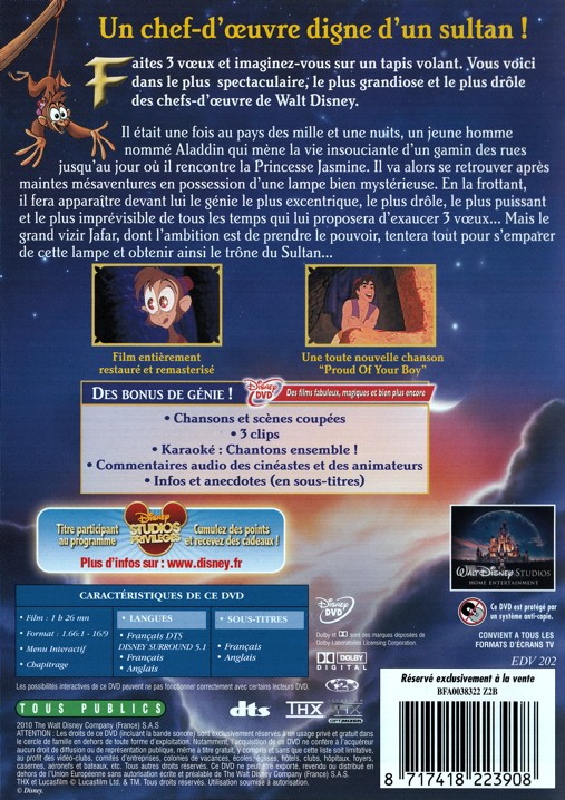 Il était une fois au pays des mille et une nuits, un jeune homme nommé Aladdin qui mène la vie insouciante d'un gamin des rues jusqu'au jour où il rencontre la princesse Jasmine. Il va alors se retrouver après maintes mésaventures en possession d'une lampe bien mystérieuse et habitée par le génie le plus excentrique et le plus imprévisible qui soit. Mais le grand vizir Jafar, dont l'ambition est de prendre le pouvoir, tentera tout pour s'emparer de cette lampe et obtenir ainsi le trône du Sultan...