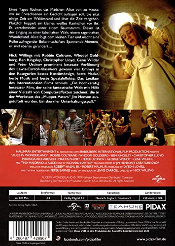 Nick Willings mit Robbie Coltrane, Whoopi Goldberg, Ben Kingsley, Christopher Lloyd, Gene Wilder und Peter Ustinov prominent besetzte Verfilmung des Lewis-Carroll-Klassikers gewann vier Emmys in den Kategorien bestes Kostümdesign, beste Maske, beste Musik und beste Spezialeffekte. Das Lexikon des Internationalen Films schrieb: Ein hochkarätig besetzter Film, der seine fantastische Welt mit Hilfe einer Vielzahl von Computereffekten zeichnet, die in der Werkstatt des Muppet-Vaters Jim Henson ausgetüftelt wurden. Ein skurriler Unterhaltungsspass.