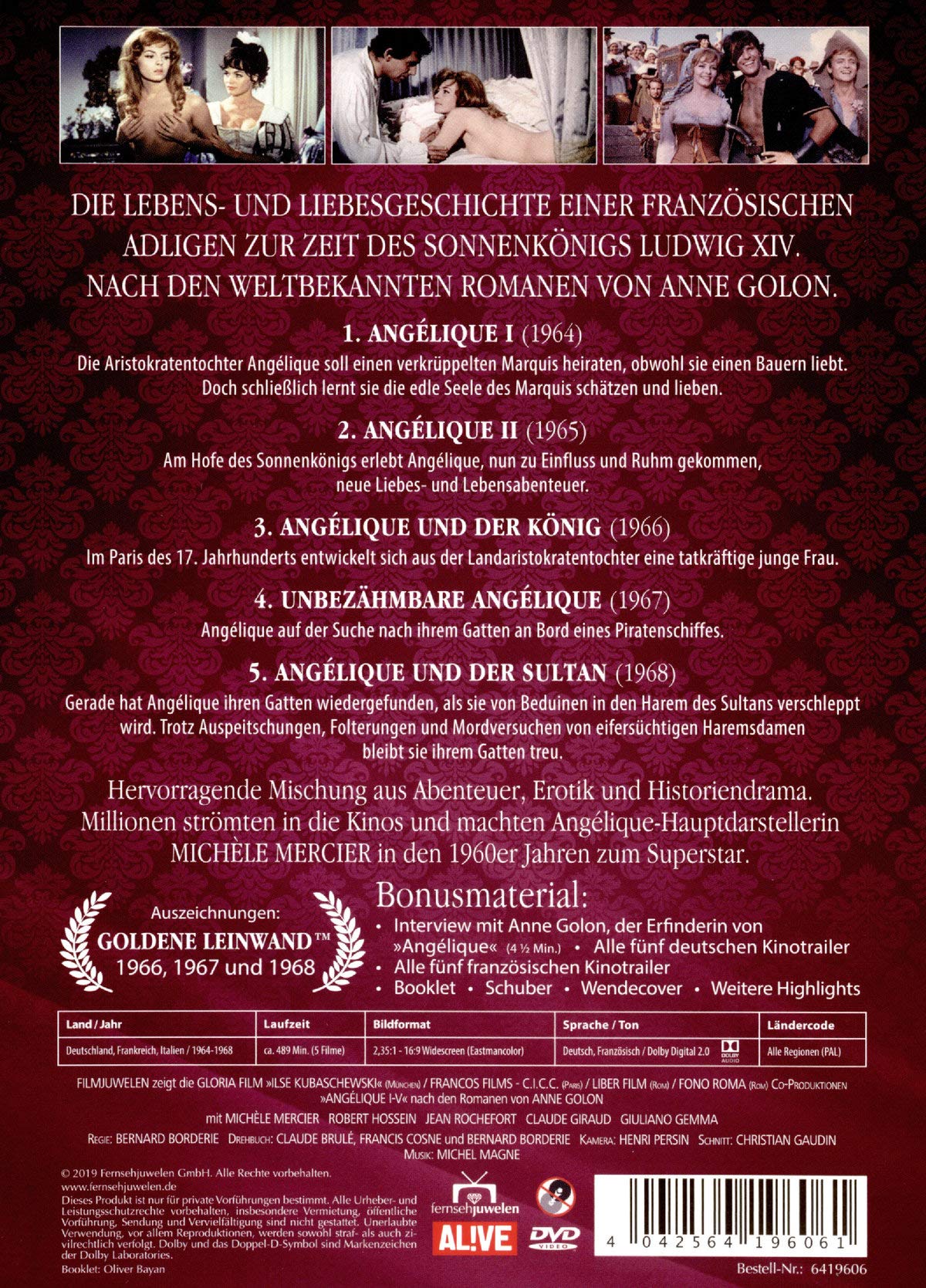 Die Lebens- und Liebesgeschichte einer französischen Adligen zur Zeit des Sonnenkönigs Ludwig XIV. , nach den Romanen von Anne Golon. 1. Angélique I (1964): Die Aristokratentochter Angelique soll einen verkrüppelten Marquis heiraten, obwohl sie einen Bauern liebt. Doch schliesslich lernt sie die edle Seele des Marquis schätzen und lieben. 2. Angélique II (1965): Am Hofe des Sonnenkönigs erlebt Angelique, nun zu Einfluss und Ruhm gekommen, neue Liebes- und Lebensabenteuer. 3. Angélique und der König (1966): Im Paris des 17. Jahrhunderts entwickelt sich aus der Landaristokratentochter eine tatkräftige junge Frau. 4. Unbezähmbare Angélique (1967): Angelique auf der Suche nach ihrem Gatten an Bord eines Piratenschiffes. 5. Angélique und der Sultan (1968): Gerade hat Angelique ihren Gatten wiedergefunden, als sie von Beduinen in den Harem des Sultans verschleppt wird. Trotz Auspeitschungen, Folterungen und Mordversuchen von eifersüchtigen Haremsdamen bleibt sie ihrem Gatten treu.