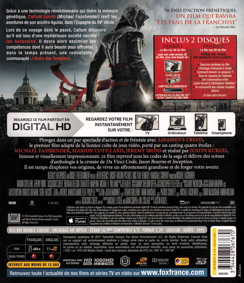 Condamné à mort, Callum Lynch se voit offrir une seconde chance par les laboratoires Abstergo Industries. Grâce à une technologie révolutionnaire qui libère la mémoire génétique contenue dans son ADN, il revit les souvenirs de son ancêtre Aguilar de Meriba membre de la société secrète des Assassins à l'époque de l'inquisition espagnole. Luttant contre l'ordre des Templiers et leur soif de pouvoir, la Confrérie des Assasins combat pour protéger le libre arbrite de l'humanité.