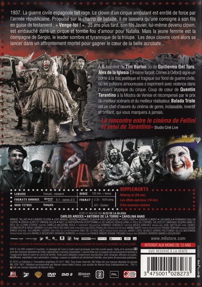 1937. La guerre civile espagnole fait rage. Le clown d'un cirque ambulant est enrôlé de force par l'armée républicaine. Propulsé sur le champ de bataille, il ne laissera qu'une consigne à son fils en guise de testament : "Venge-toi !". 35 ans plus tard, son fils Javier, lui-même devenu clown, est embauché dans un cirque et tombe fou d'amour pour Natalia. Mais la jeune femme est la compagne de Sergio, le leader sombre et tyrannique de la troupe. Les deux clowns vont alors se lancer dans un affrontement mortel pour gagner le coeur de la belle acrobate...