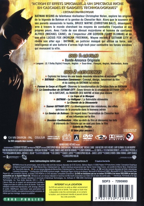 Alors que le souvenir de ses parents assassinés le hante, Bruce Wayne, désemparé, erre à travers le monde cherchant les moyens de combattre l'injustice et ses propres peurs. Avec l'aide de son dévoué majordome et homme de confiance Alfred, de l'inspecteur Jim Gordon et de son allié Lucius Fox, Wayne revient à Gotham City et révèle son alter ego : Batman, un justicier masqué qui utilise sa force, son intelligence et une batterie d'armes high-tech pour combattre les forces sinistres qui menacent la ville...