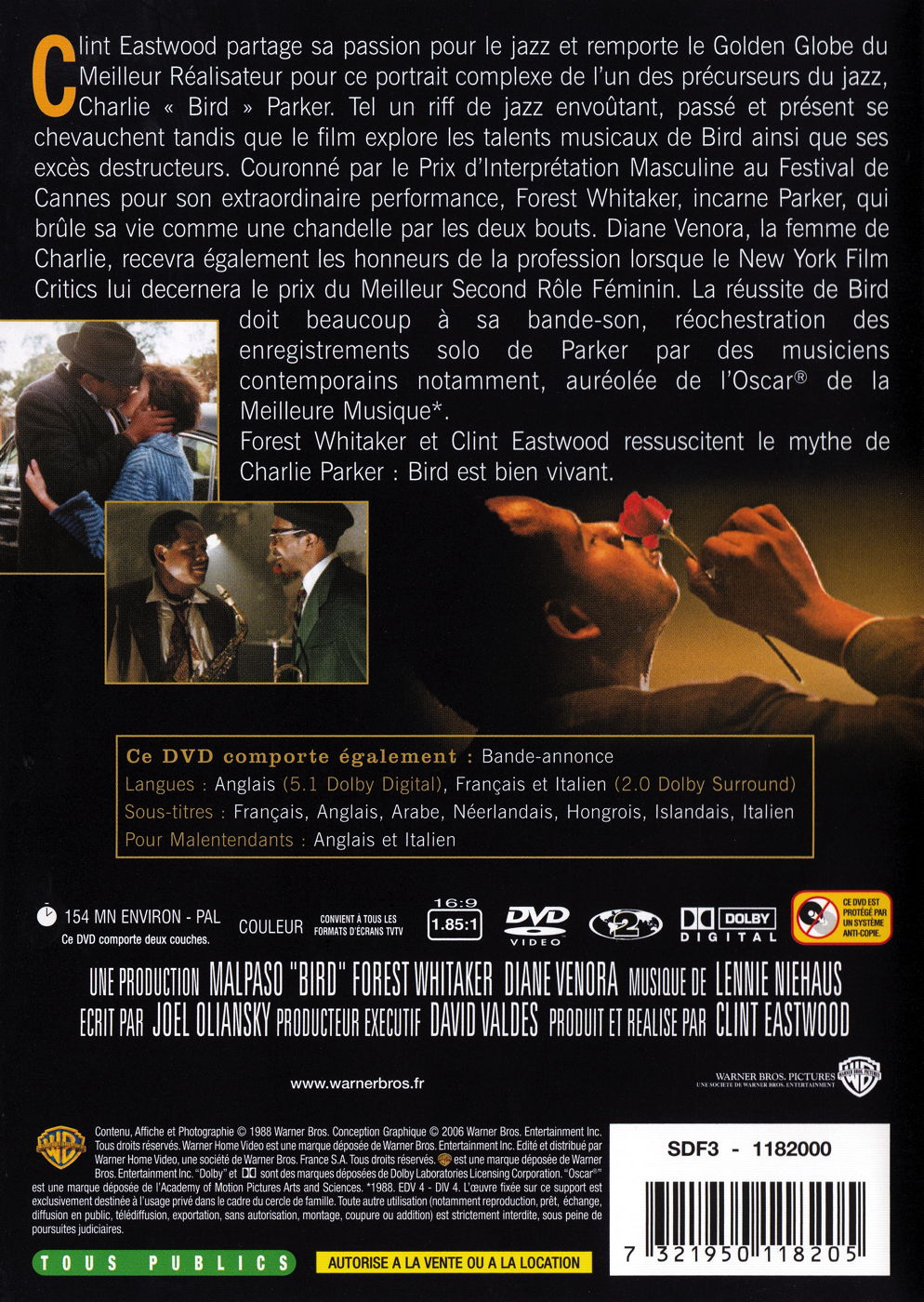 Clint Eastwood, lui-même un fervent fan de jazz, a remporté le Golden Globe de la Meilleure Réalisation pour ce récit émouvant de la vie du pionnier du jazz Charlie "Yardbird" Parker. Tout comme dans une mélodie de jazz hypnotique, passé, présent et futur s'entremêlent parfaitement dans cette exploration du talent inégalé et des tendances destructives de Bird. Lors du Festival du Film de Cannes, Forest Whitaker a remporté le Prix du Meilleur Acteur pour son interprétation d'un homme qui brûle sa chandelle par les deux bouts. Diane Venora, dans le rôle de sa femme persévérante Chan, s'est elle aussi lovée dans la lueur de la gloire, ce qui lui a valu un Award pour le Meilleur Rôle Secondaire de la part des New York Film Critics. Mais c'est à la musique que revient le plus grand honneur: en combinant avec maestria les enregistrements solo de Parker avec des musiciens modernes, la bande originale de Bird est un petit chef-d'oeuvre particulièrement swinguant. L'Oscar®* du Meilleur Son en est le résultat logique. Un point d'orgue saisissant pour l'ode magistrale d'Eastwood à la musique intemporelle de Bird.