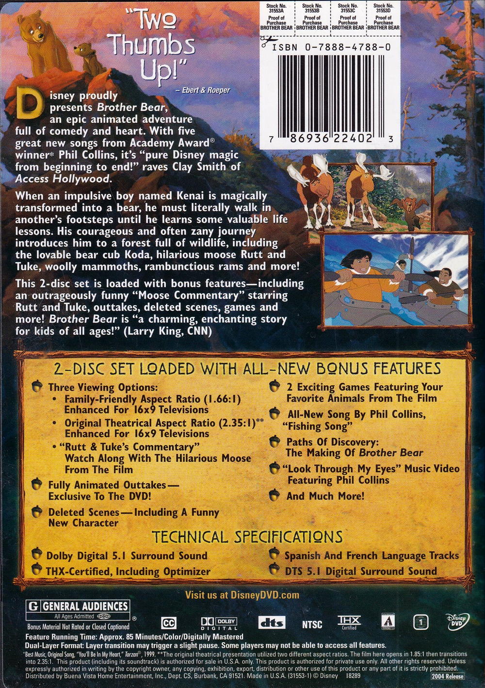 Disney proudly presents Brother Bear, an epic animated adventure full of comedy and heart. With five great new songs from Academy Award winner* Phil Collins, it's "pure Disney magic from beginning to end! " raves Clay Smith of Access Hollywood.