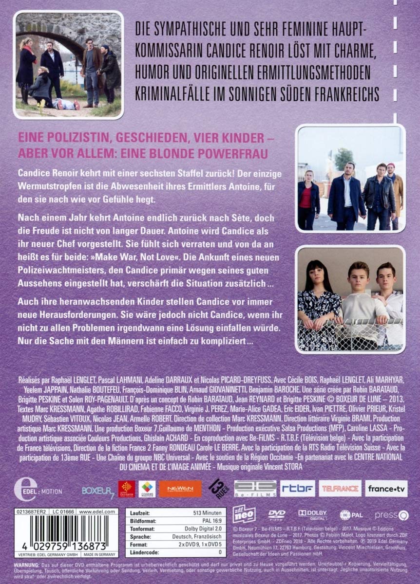 Selbstsicher, voller Lebensfreude und charmant wie eh und je kehrt Candice Renoir mit einer sechsten Staffel zurück! Der einzige Wermutstropfen ist die Abwesenheit ihres Ermittlers Antoine, für den sie nach wie vor Gefühle hegt. Nach einem Jahr kehrt Antoine endlich zurück nach Sète, doch die Freude ist nicht von langer Dauer. Antoine wird Candice als ihr neuer Chef vorgestellt. Sie fühlt sich verraten und von da an heisst es für beide: ‚Make War, Not Love‘. Die Ankunft eines neuen Polizeiwachtmeisters, den Candice primär wegen seines guten Aussehens eingestellt hat, verschärft die Situation zusätzlich...Auch ihre heranwachsenden Kinder stellen Candice vor immer neue Herausforderungen. Sie wäre jedoch nicht Candice, wenn ihr nicht zu allen Problemen irgendwann eine Lösung einfallen würde. Nur die Sache mit den Männern ist einfach zu kompliziert…