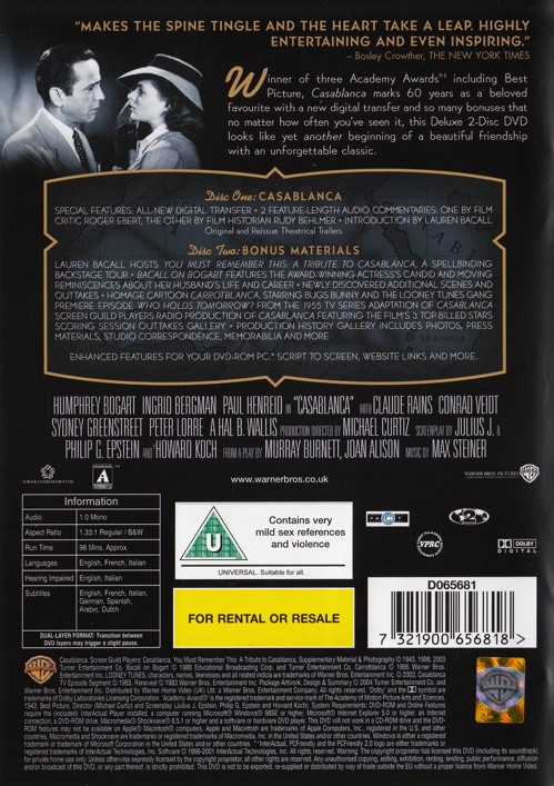 Rick et Lisa se sont aimés, puis séparés. Quelques années après, dans le chaos de la Deuxième Guerre mondiale, Lisa débarque à Casablanca avec son époux, héros de la résistance. Rick, devenu un propriétaire de Night Club cynique et détaché de tout, est le seul à pouvoir aider le couple à s'échapper. Mais il refuse jusqu'à ce qu'Isa réveille l'idéaliste qui dort en lui. Casablanca a acquis au cours des ans la stature de réelle légende hollywoodienne. 3 Oscars.