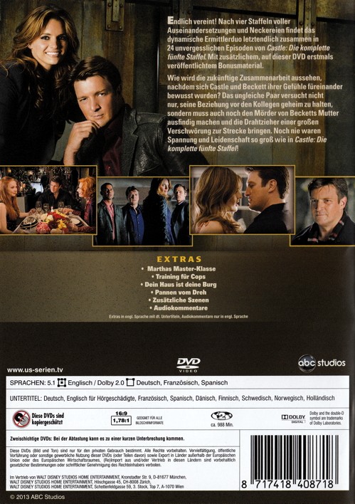 Wie wird die zukünftige Zusammenarbeit aussehen, nachdem sich Castle und Beckett ihrer Gefühle füreinander bewusst wurden? Das ungleiche Paar versucht nicht nur, seine Beziehung vor den Kollegen geheim zu halten, sondern muss auch noch den Mörder von Becketts Mutter ausfindig machen und die Drahtzieher einer grossen Verschwürung zur Strecke bringen. Noch nie waren Spannung und Leidenschaft so grosse wie in Castle: Die komplette fünfte Staffel!
