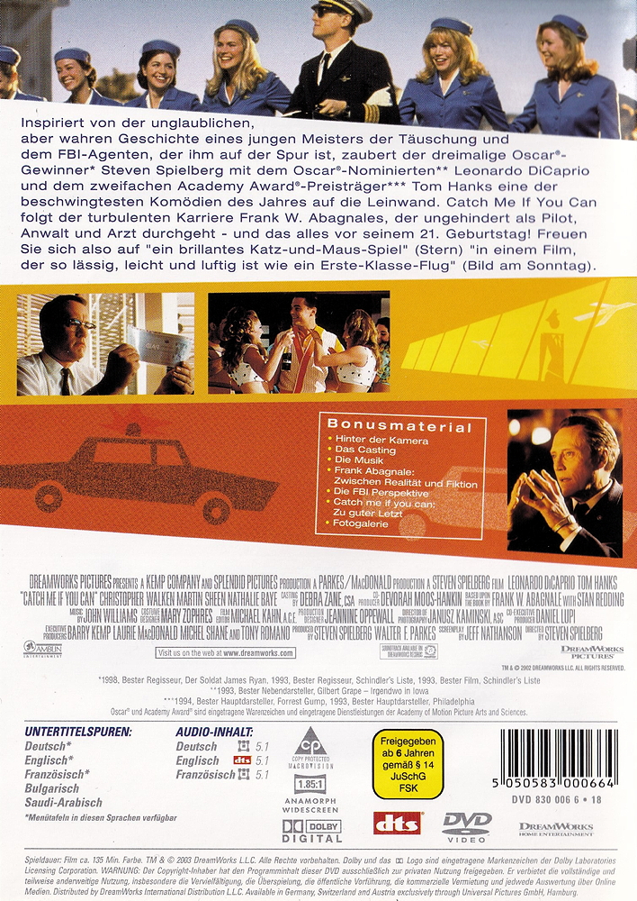 Inspiriert von der unglaublichen, aber wahren Geschichte eines jungen Meisters der Täuschung und dem FBI-Agenten, der ihm auf der Spur ist, zaubert der dreimalige Oscar-Gewinner Steven Spielberg mit dem Oscar-Nominierten Leonardo DiCaprio und dem zweifachen Acedemy Award-Preisträger Tom Hanks eine der beschwingtesten Komödien des Jahres auf der Leinwand. Catch Me If You Can folgt der turbulenten Karriere Frank W. Abagnales, der ungehindert als Pilot, Anwalt und Arzt durchgeht und das alles vor seinem 21. Geburtstag! Freuen Sie sich also auf "ein brillantes Katz-und-Maus-Spiel" (Stern) "in einem Film, der so lässig, leicht und luftig ist wie ein Erste-Klasse-Flug" (Bild am Sonntag).