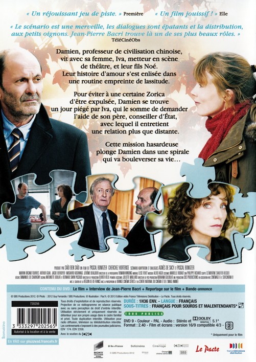 Damien, professeur de civilisation chinoise, vit avec sa femme, Iva, metteur en scène de théâtre, et leur fils Noé. Leur histoire d’amour s'est enlisée dans une routine empreinte de lassitude. Pour éviter à une certaine Zorica d'être expulsée, Damien se trouve un jour piégé par Iva, qui le somme de demander l'aide de son père, conseiller d'État, avec lequel il entretient une relation plus que distante. Cette mission hasardeuse plonge Damien dans une spirale qui va bouleverser sa vie...