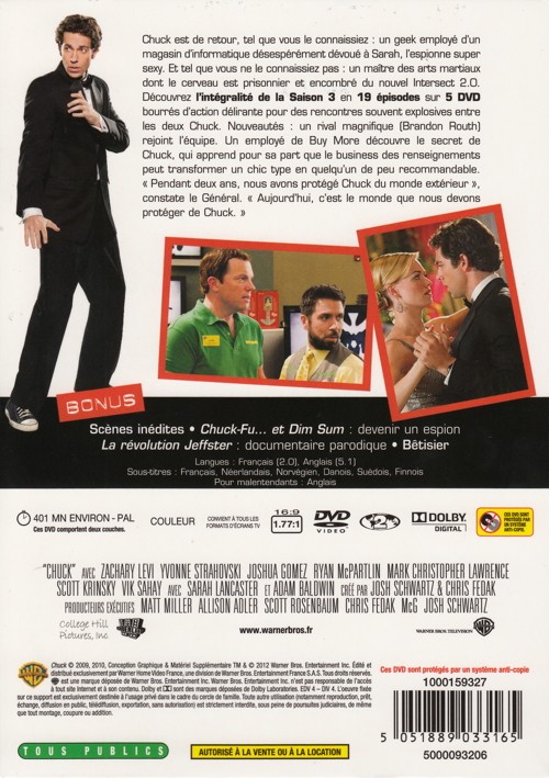Chuck est de retour, tel que vous le connaissiez : un geek employé d'un magasin d'informatique désespérément dévoué à Sarah, l'espionne super sexy, Et tel quw vous ne le connaissiez pas : un maître des arts martiaux dont le cerveau est prisionner et encombré du nouvel Intersect 2.0. Découvrez l'intégralitéde la Saison 3 en 19 épisodes sur 5 DVD bourrés d'action délirante pour des recontres souvent explosives entre les deux Chuck. Nouveautés : un rival magnifique (Brandon Routh) rejoint l'équipe. Un employé de Buy More découvre le secret de Chuck, qui apprend pour sa part que le buisness des renseignements peut transformer un chic type en quelqu'un de peu recommandable. "Pendant deux ans, nous avons protégé Chuck du monde extérieur", constate le général. "Aujourd'hui, c'est le monde que nous devons protéger de Chuck."