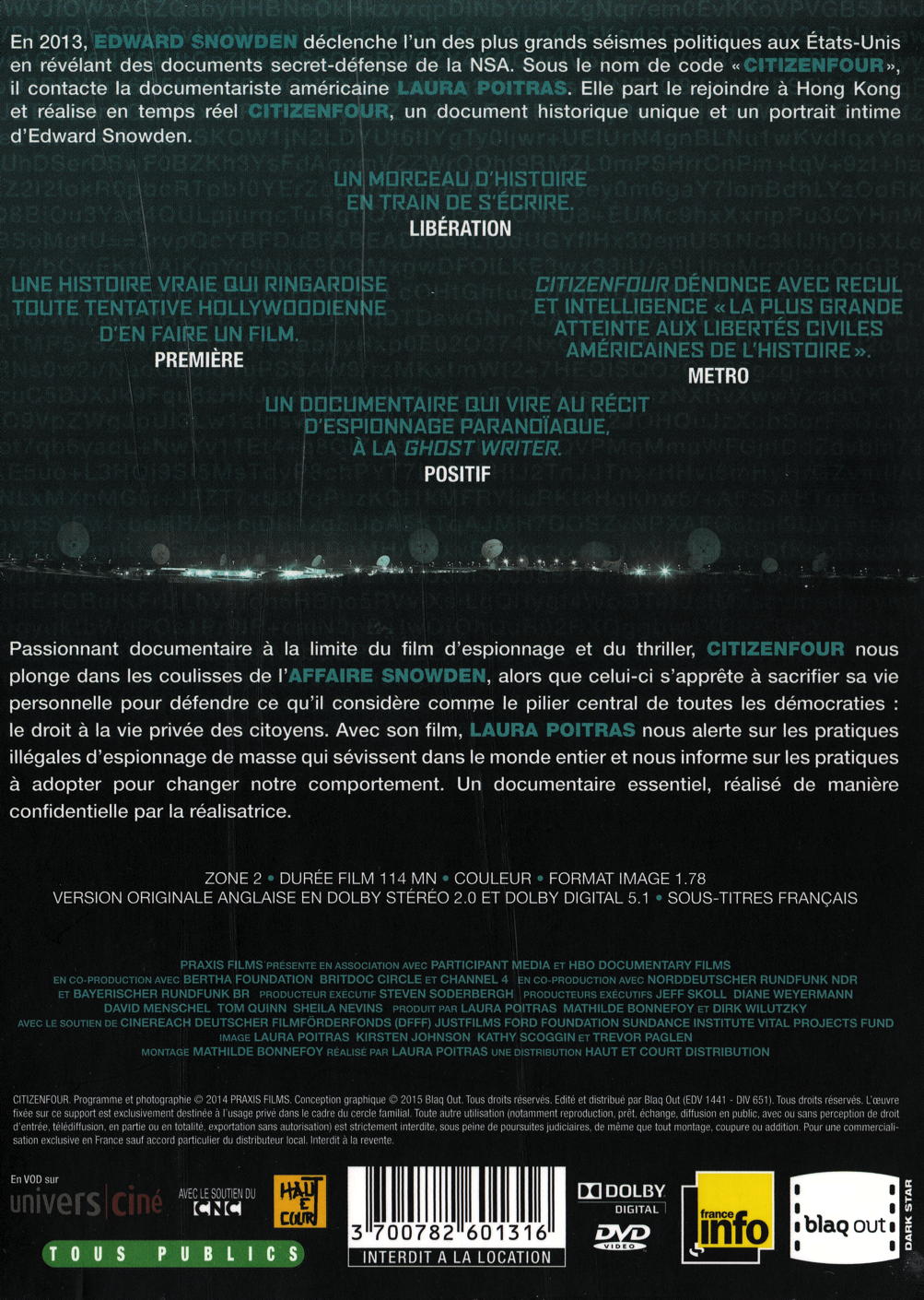 En 2013, Edward Snowden déclenche l'un des plus grands séismes politiques aux Etats-Unis en révélant des documents secret-défense de la NSA. Sous le nom le code "Citizenfour", il contacte la documentariste américaine Laura Poitras. Elle part le rejoindre à Hong Kong et réalise en temps réel CitizenFour, un document historique unique et un portrait intime d?Edward Snowden.