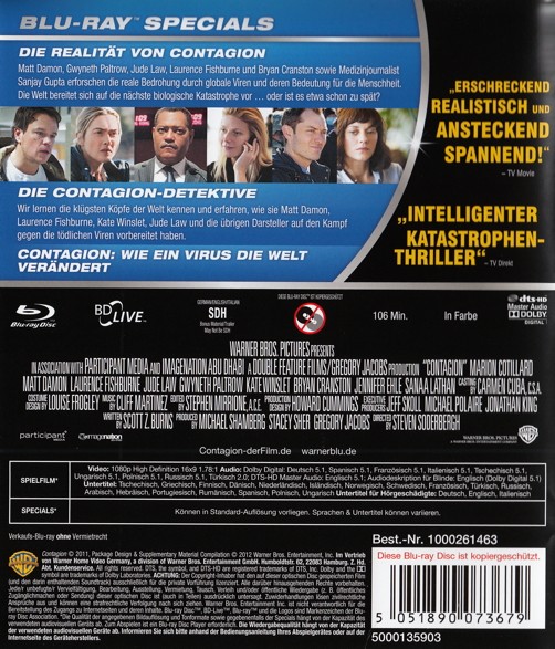 Als sich tödliches, durch die Luft übertragenes Virus rasend schnell ausbreitet und die gesamte Menschheit gefährdet, arbeiten Mediziner weltweit fieberhaft daran, einen Impfstoff zu entwickeln und die Panik einzudämmen. Die Hauptrollen spielen die Oscar-Preisträger Matt Damon, Gwyneth Paltrow, Kate Winslet, Mrion Cotillard sowie Oscar-Kanditaten Jude Law und Laurence Fishburne. Die Spannung steigt ins Unterträgliche, als deutlich wird, dass sich das Virus nicht aufhalten lässt: Seuchenexperten, Militärs, die Weltgesundheitsbehörde und normale Bürger sind pausenlos im Einsatz, um den Ursprung des Virus zu analysieren udn ein Gegenmittel zu finden, bevor es zu spät ist. Regisseur Steven Sonderbergh zeigt in seinem exemplarischen Thriller, wie Mut uns zusammenschweisst, wenn die gesellschaftlichen Strukturen auseinanderbrechen.