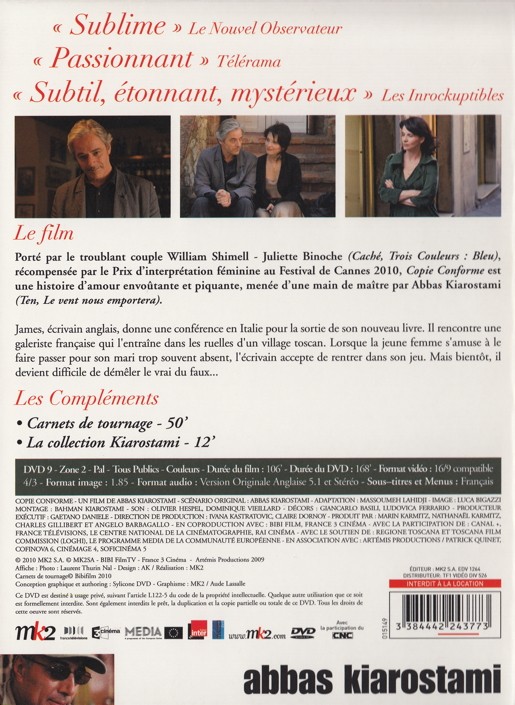 - Schauspieler Juliette Binoche, Jean-Claude Carrière, William Shimell, Agathe Natanson, Gianna Giachetti, Adrian Moor, Angelo Barbagallo, Andrea Laurenzi, Filippo Troiano, Manuela Balsimelli