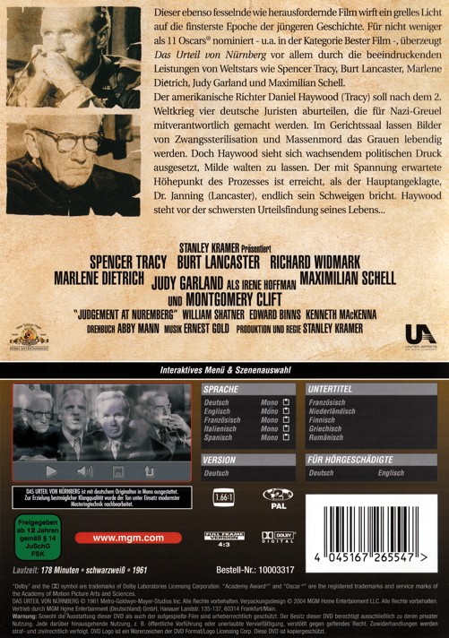 Burt Lancaster, Bess Flowers, Sam Harris, William Shatner, Richard Widmark, Maximilian Schell, Bert Stevens, Ray Teal, Harold Miller, Marlene Dietrich...William H. O'Brien, Ben Wright, Spencer Tracy, Hal Taggart, Colin Kenny, Karl Swenson, Joseph Crehan, Torben Meyer, Sayre Dearing, Ed Nelson, Montgomery Clift, Virginia Christine, Otto Waldis, Norbert Schiller, John Wengraf, Werner Klemperer, Judy Garland, Edward Binns, Oscar Beregi Jr., Alan Baxter, Martin Brandt, Howard Caine, Joseph Bernard, Paul Busch, Bernard Kates, John Clarke, Sheila Bromley, Jana Taylor, Asher Brauner, Kenneth MacKenna, Olga Fabian, Rudy Solari