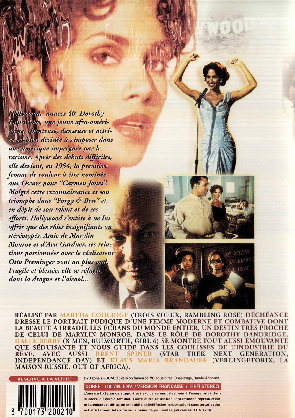Hollywood, années 40, Dorothy Dandridge, une jeune afro américaine, chanteuse, danseuse et actrice est bien décidée à s'imposer dans une amérique imprégnée par le racisme. Après des débuts difficiles, elle devient, en 1954, la première femme de couleur à être nominée aux oscars pour Carmen Jones. Malgré cette reconnaissance et son triomphe dans Porgy & Bess et, en dépit de son talent et de ses efforts, Hollywood s'entête à ne lui offrir que des rôles insignifiants ou stéréotypés. Amie de Marylin Monroe et d'Ava Gardner, ses relations passionnées avec le réalisateur Otto Preminger vont au plus mal, fragile et blessée, elle se réfugie dans la drogue et l'alcool...