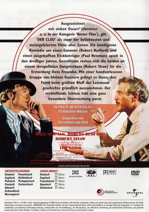 Ausgezeichnet mit sieben Oscars® (darunter u. a. in der Kategorie 'Bester Film'), gilt 'Der Clou' als einer der beliebtesten und meistgefeierten Filme aller Zeiten. Die intelligente Komödie um einen Ganoven (Robert Redford) und einen ausgebufften Trickbetrüger (Paul Newman) spielt in den dreissiger Jahren. Gemeinsam rächen sich die beiden an einem skrupellosen Gangsterboss (Robert Shaw) für die Ermordung ihres Freundes. Mit einer handverlesenen Gruppe von kleinen Gaunern gelingt es ihnen, den Feind beim grössten Bluff der Leinwandgeschichte gründlich auszunehmen. Der verblüffende Schluss hält eine ganz besondere Überraschung parat.