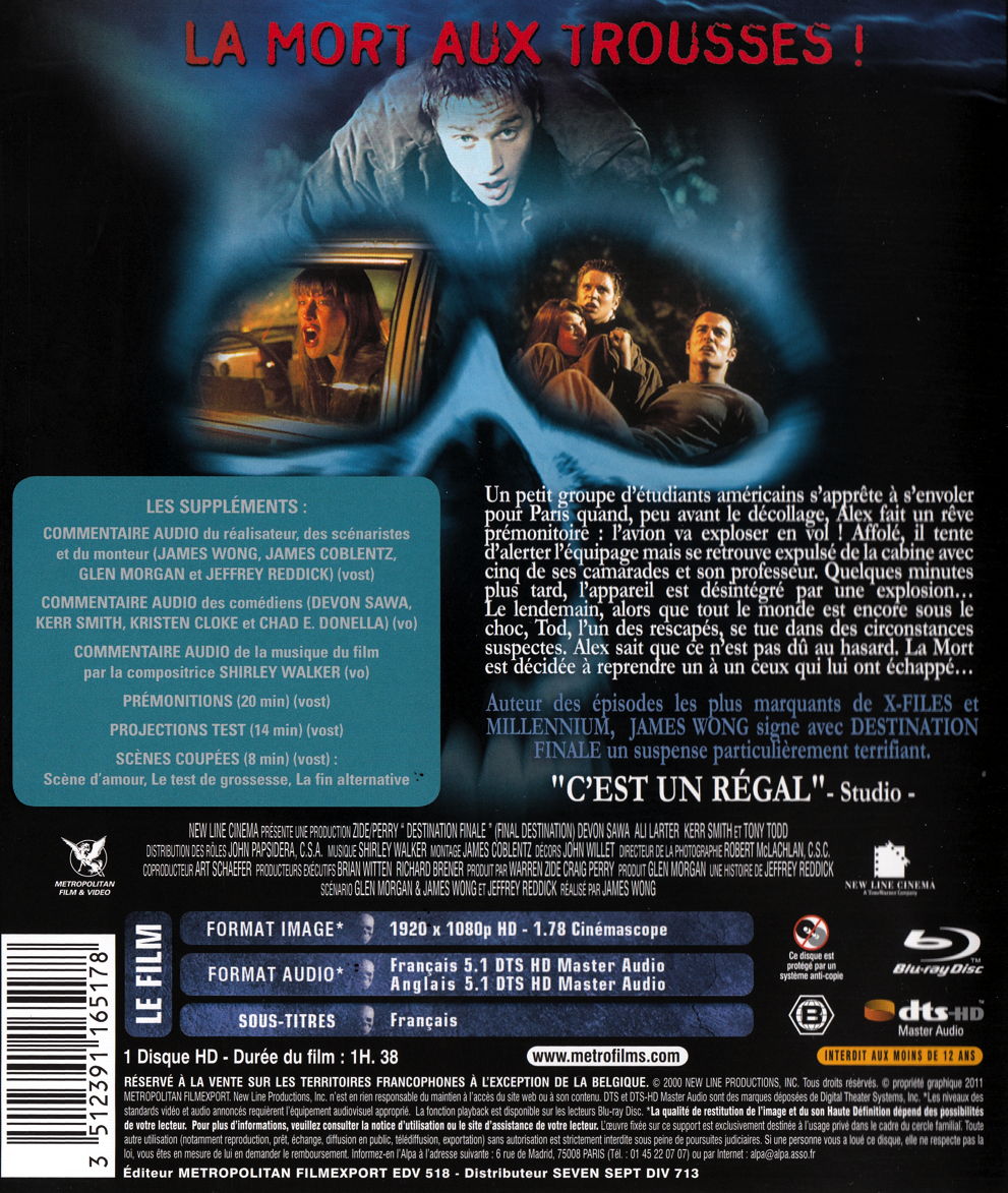 Pour le petit groupe d'etudiants, le voyage a Paris s'annoncait bien. Mais peu avant le decollage de leur avion, Alex a soudain une vision fulgurante: l'appareil va exploser en vol. Parce qu'il va tenter d'alerter les passagers, il sera expulse de l'avion avec cinq de ses camarades et son professeur. Lorsque, quelques minutes plus tard, l'appareil explose, ils seront les seuls survivants... Pour Alex, ce don de voyance qui lui a sauve la vie est aussi une malediction. Comment expliquer ses visions? D'ou lui vient ce fascinant pouvoir?