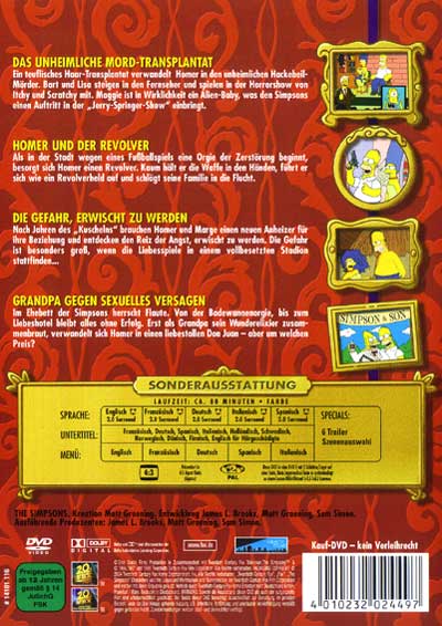 Ein teuflisches Haar-Transplantat verwandelt Homer in den unheimlichen Hackebeil-Mörder. Bart und Lisa steigen in den Fernseher und spielen in der Horrorshow von Itchy und Scratchy mit. Maggie ist in Wirklichkeit ein Alien-Baby, was den Simpsons einen Auftritt in der "Jerry-Springer-Show" einbringt.