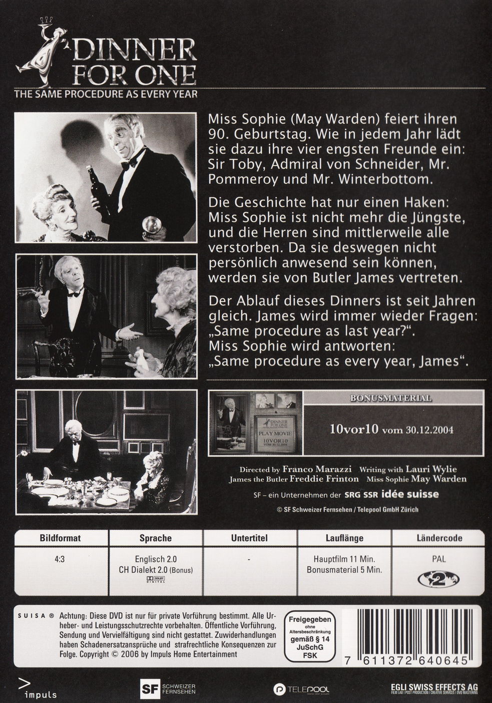 C'est l'histoire d'une vieille Lady anglaise, Miss Sophie,, qui fête son 9Oième anniversaire avec ses quatre meilleurs amis, seulement ils sont morts depuis longtemps. Le majordome se chage de les remplacer. Et chaque année c'est "the same procedure as every year."