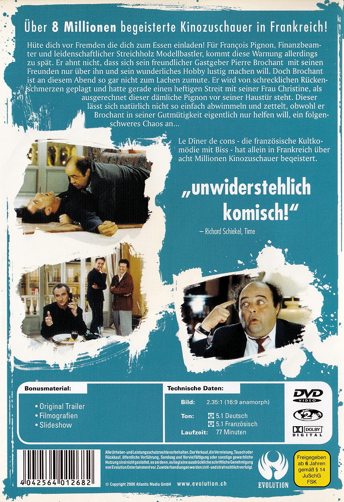 Le Diner de cons - die französsche Kultkomödie mit Biss - hat allein in Frankreich über acht Millionen Kinozuschauer begeistert und zählt bis heute zu den erfolgreichsten französischen Komödien. Hüte dich vor Fremden die dich zum Essen einladen! Für Francois Pignon, Finanzbeamter und leidenschaftlicher Streichholz Modellbastler, kommt diese Warnung allerdings zu spät. Er ahnt nicht, dass sich sein freundlicher Gastgeber Pierre Brochant mit seinen Freunden nur über ihn und sein wunderliches Hobby lustig machen will. Doch Brochant ist an diesem Abend so gar nicht zum Lachen zumute. Er wird von schrecklichen Rückenschmerzen geplagt und hatte gerade einen heftigen Streit mit seiner Frau Christine, als ausgerechnet dieser dämliche Pignon vor seiner Haustür steht. Dieser lässt sich natürlich nicht so einfach abwimmeln und zettelt, obwohl er Brochant in seiner Gutmütigkeit eigentlich nur helfen will, ein folgenschweres Chaos an...