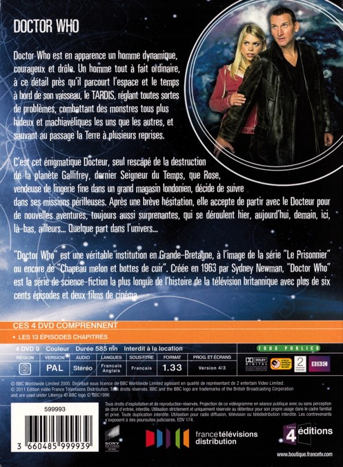 Doctor Who est en apparence un homme dynamique, courageux et drôle. Un homme tout à fait ordinaire, à ce détail près qu'il parcourt l'espace et le temps à bord de son vaisseau, le TARDIS, réglant toutes sortes de problèmes, combattant des monstres tous plus hideux et machiavéliques les uns que les autres, et sauvant au passage la Terre à plusieurs reprises. C'est cet énigmatique Docteur, seul rescapé de la destruction de la planète Gallifrey, dernier Seigneur du Temps, que Rose, vendeuse de lingerie fine dans un grand magasin londonien, décide de suivre dans ses missions périlleuses. Après une brève hésitation, elle accepte de partir avec le Docteur pour de nouvelles aventures, toujours aussi surprenantes, qui se déroulent hier, aujourd'hui, demain, ici, là-bas, ailleurs... Quelque part dans l'univers... "Doctor Who" est une véritable institution en Grande-Bretagne, à l image de la série "Le Prisonnier« ou encore de "Chapeau melon et bottes de cuir". Créée en 1963 par Sydney Newman, « Doctor Who » est la série de sciencefiction la plus longue de l histoire de la télévision britannique avec plus de six cents épisodes et deux films de cinéma.