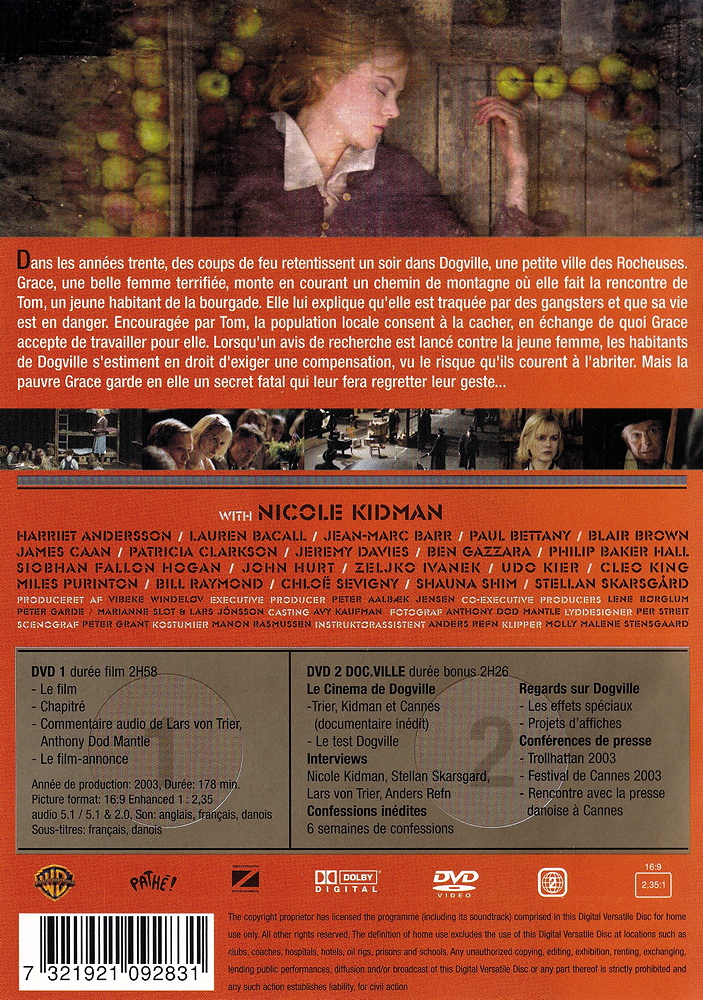 Sortie de nulle part, une belle fugitive, Grace, trouve refuge dans la communauté isolée de Dogville. Les habitants consentent à la cacher, en échange de quoi Grace accepte de travailler pour eux. Lorsqu'un avis de la police est lancé contre elle, les gens de Dogville s'estiment en droit d'exiger une compensation. La pauvre Grace apprend ainsi à ses dépens que la bonté est relative. Mais elle garde un secret fatal, qui fera regretter à Dogville d'avoir montré les dents...