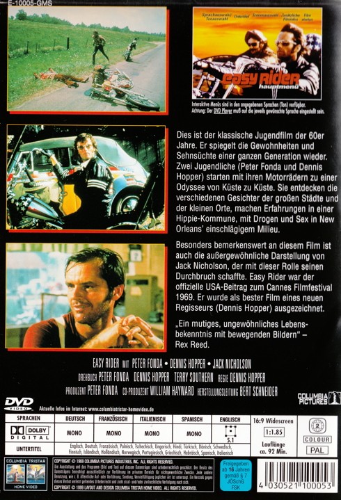 Dies ist der klassische Jugendfilm der 60er Jahre. Er spiegelt die Gewohnheiten und Sehnsüchte einer ganzen Generation wieder. Zwei Jugendliche Peter Fonda und Dennis Hopper starten mit ihren Motorrädern zu einer Odyssee von Küste zu Küste. Sie entdecken die verschiedenen Gesichter der grossen Städte und der kleinen Orte, machen Erfahrungen in einer Hippie-Kommune, mit Drogen und Sex in New Orleans' einschlägigem Milieu. Besonders bemerkenswert an diesem Film ist auch die aussergewöhnliche Darstellung von Jack Nicholson, der mit dieser Rolle seinen Durchbruch schaffte. Easy Rider war der offizielle USA-Beitrag zum Cannes Filmfestival 1969. Er wurde als bester Film eines neuen Regisseurs Dennis Hopper ausgezeichnet.