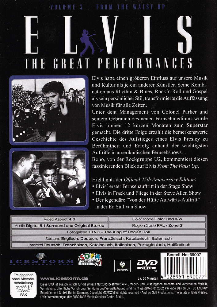 Highlights der Official 25th Anniversary Edition: -Elvis' erster Fernsehauftritt in der Stage Show -Elvis in Frack und Fliege in der Steve Allen Show -Der legendäre "Von der Hüfte Aufwärts-Auftritt" in der Ed Sullivan Show
