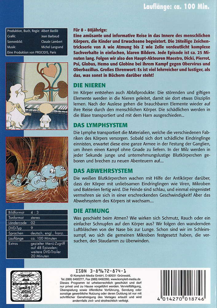 Die Lymphe transportiert die Materialien, welche die verschiedenen Fabriken des Körpers versorgen. Sobald sich dort schädliche Eindringlinge einnisten, erwartet diese eine ganze Armee in der Festung der Ganglien, um ihnen einen Kampf ohne Gnade zu liefern. In der Milz werden in jeder Sekunde junge und unternehmungslustige Blutkörperchen geboren und brechen zu neuen Abenteuern auf...