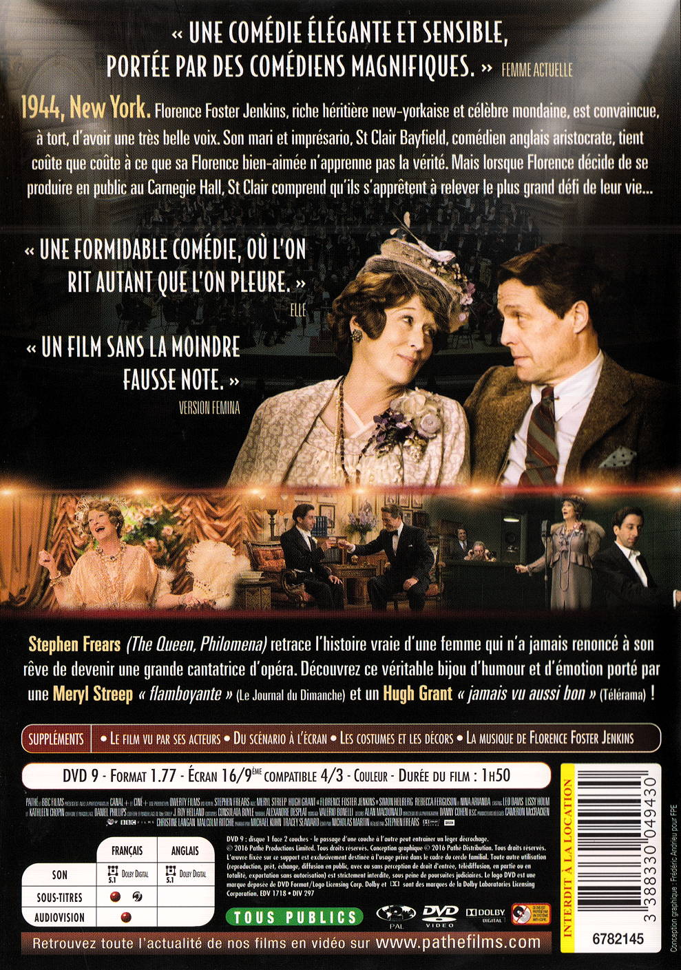L'histoire vraie de Florence Foster Jenkins, héritière new-yorkaise et célèbre mondaine, qui n'a jamais renoncé à son rêve de devenir une grande cantatrice d'opéra. Si elle était convaincue d'avoir une très belle voix, tout son entourage la trouvait aussi atroce que risible. Son "mari" et imprésario, St Clair Bayfield, comédien anglais aristocratique, tenait coûte que coûte à ce que sa Florence bien-aimée n'apprenne pas la vérité. Mais lorsque Florence décide de se produire en public à Carnegie Hall en 1944, St Clair comprend qu'il s'apprête à relever le plus grand défi de sa vie...